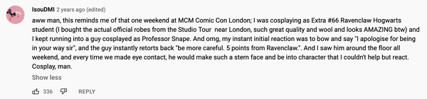 Cosplaying consists of a community of all sorts of people and is inclusive of everyone. A common factor from this community is that they are "geeky" or "nerdy" in one way or another. From the videos included, all participants engage in cosplay to feel a level of confidence and to feel like they belong to a community. In Savage’s case, he found comfort in the subculture as he grew up dressing in costumes as a child such as the shark from Jaws, an Astronaut and a knight like in Excalibur. This led him to join the cosplaying community of Comic-Con where he cosplayed No Face from Spirited Away and Hellboy. He brought this hobby into his career where in his show Mythbusters, Savage dresses up as a plethora of characters for the enjoyment of the show and himself. Along with these videos, I have included commentary made on these Youtube clips (please click to see them easier).